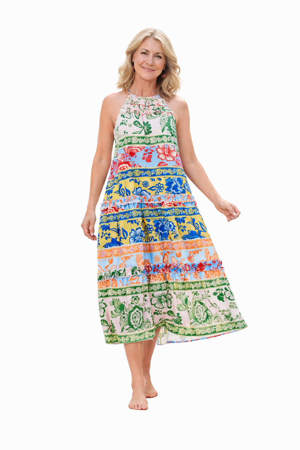 Aoife captures effortless boho charm with a graceful halter neckline, tiered layers, and a fluid maxi length that moves beautifully with every step. Light, airy, and full of character, this dress brings relaxed sophistication to warm-weather moments, from beach strolls to laid-back brunches.