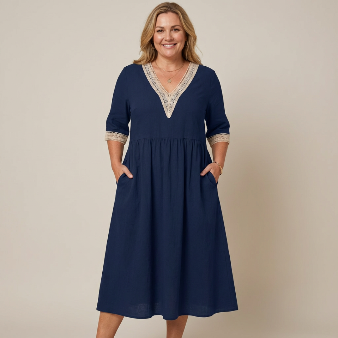 The Joanna Dress combines comfort and charm with its loose, mid-length design and delicate lace collar. Crafted for ease and style, it offers a relaxed fit that flatters every shape — perfect for casual days, cozy gatherings, or simply feeling put together without the fuss.